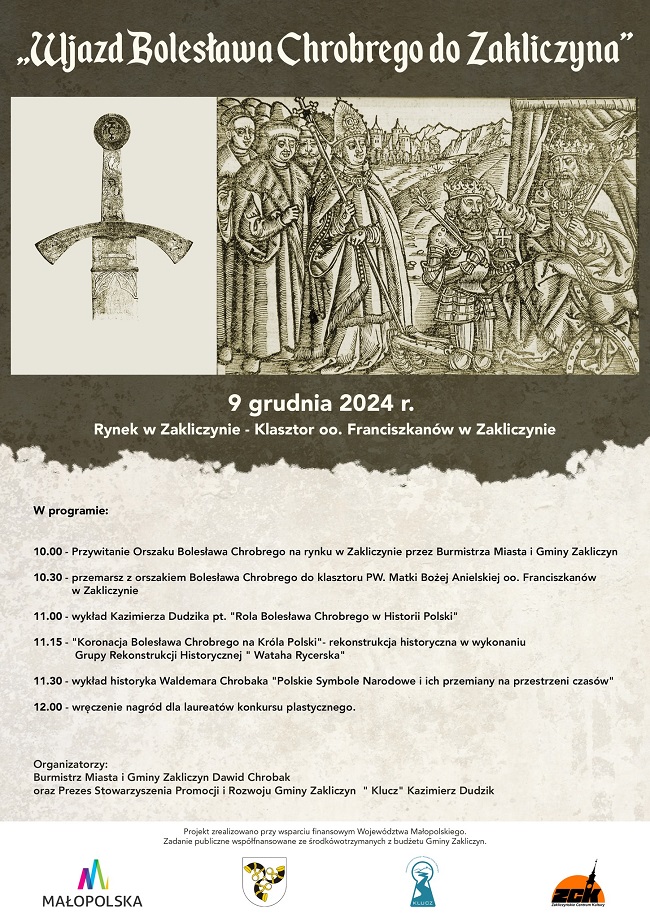 Wydarzenie edukacyjne jest możliwe do przeprowadzenia dzięki grantowi, jakie Stowarzyszenie „Klucz” otrzymało od Województwa Małopolskiego w wysokości 10 tysięcy złotych na realizację wydarzenia pod nazwą „Wjazd Bolesława Chrobrego do Zakliczyna.” Stało się tak dzięki aplikacji do otwartego konkursu ofert na realizację zadań publicznych w obszarze nauki, szkolnictwa wyższego, edukacji, oświaty i wychowania w 2024 roku pod nazwą „Kocham Polskę!.”