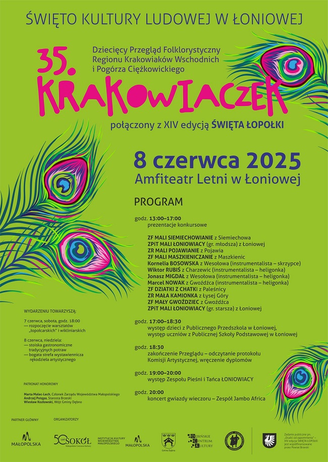 8 czerwca w amfiteatrze letnim w Łoniowej w gminie Dębno odbędzie się 35. Krakowiaczek – Dziecięcy Przegląd Folklorystyczny Regionu Krakowiaków Wschodnich i Pogórza Ciężkowickiego oraz 14. edycja Święta Łopołki, które do Łoniowej przywędrowało z sąsiedniej Niedźwiedzy. Taki to Znak czasów, że organizatorzy łączą dwa dotąd oddzielne wydarzenia, by finansowo jakoś się to wszystko spięło. Tak więc Święto Łopołki odbędzie się w przeddzień „Krakowiaczka (w sobotę) i polegać będzie na organizacji warsztatów łopołciarskich i wikliniarskich – kto zainteresowany, to podaję, że rozpocznie się to o godzinie 18 – tej.