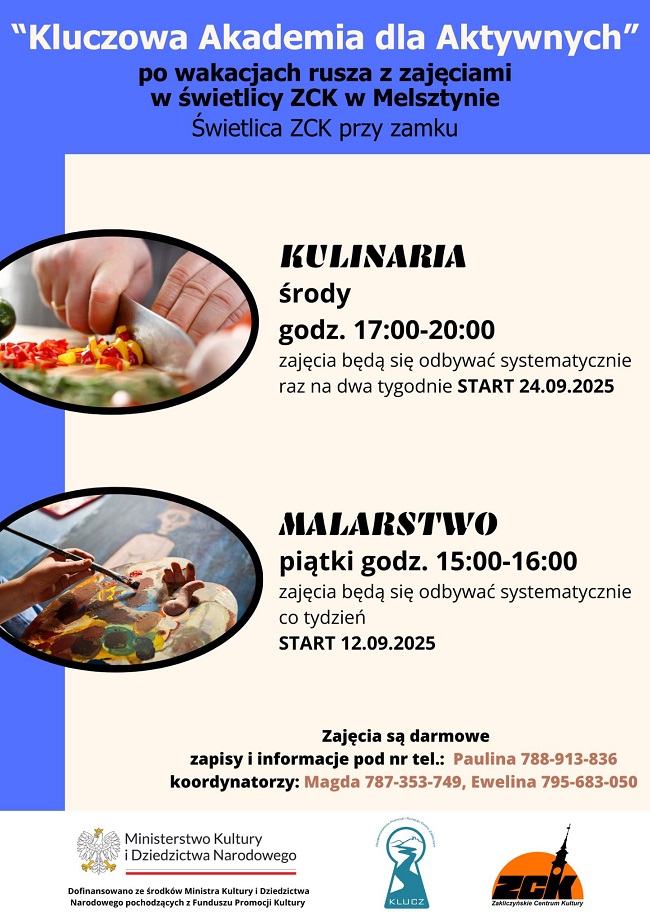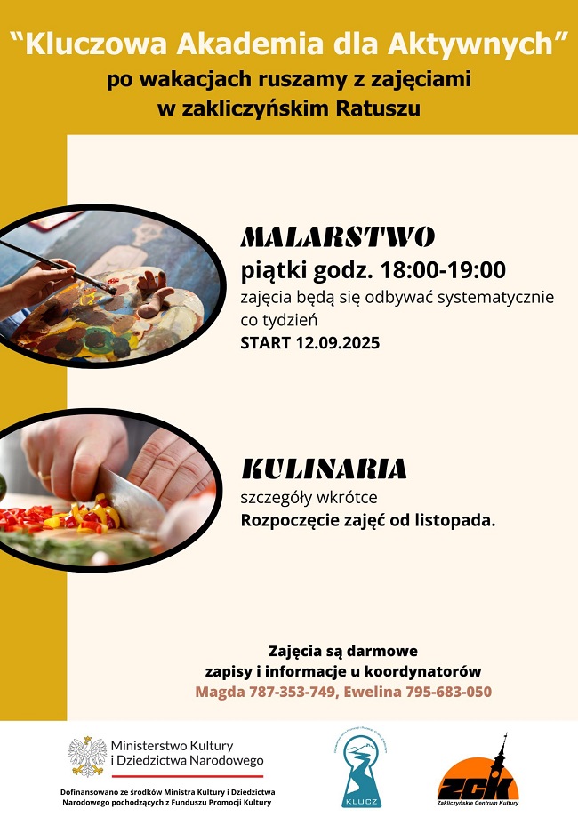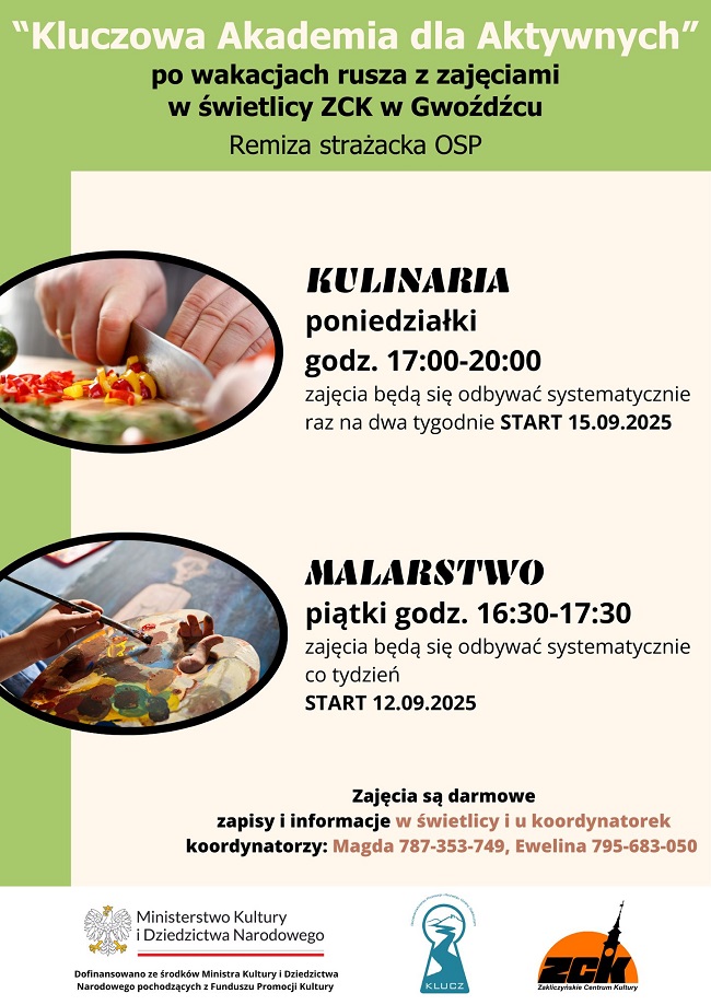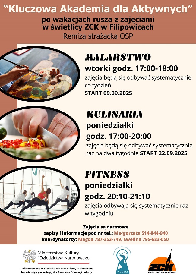 Podczas finałowej, jesiennej edycji projektu wspartej środkami otrzymanymi z budżetu Gminy Zakliczyn, realizowane będą warsztaty; malarskie, kulinarne i fitness. Udział w warsztatach jest nieodpłatny, a szczegółowe informacje na ten temat zdobędziecie u koordynatorek; Magdaleny Tobiasz i Eweliny Siepieli oraz u gospodyń świetlic.