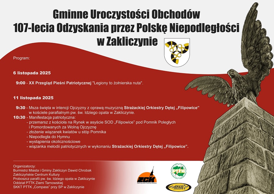 Uroczystość rozpocznie się 11 listopada o godzinie 9:30 Mszą świętą w intencji Ojczyzny, a po nabożeństwie i przemarszu w asyście Strażackiej orkiestry Dętej „Filipowice”, pod pomnikiem Poległych i Pomordowanych za Wolną Ojczyznę, na zakliczyńskim Rynku odbędzie się manifestacja patriotyczna.