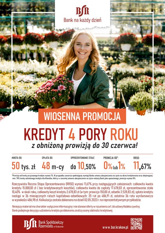 Bank Spółdzielczy Rzemiosła w Krakowie Oddział w Zakliczynie zaprasza do skorzystania z promocyjnej oferty kredytu Cztery pory roku. W przypadku wniosków złożonych do dnia 30 czerwca b.r. obniżona zostaje prowizja od kwoty przyznanego kredytu i wynosi ona: 1%. W przypadku zawarcia spełniającej wymogi Banku umowy ubezpieczenia na życie na okres kredytowania oraz obejmującej min. 70 % kwoty udzielonego kredytu dla Klientów, którzy w zawartej umowie ubezpieczenia na życie wskażą Bank jako uposażonego, prowizja wynosi 0 %.