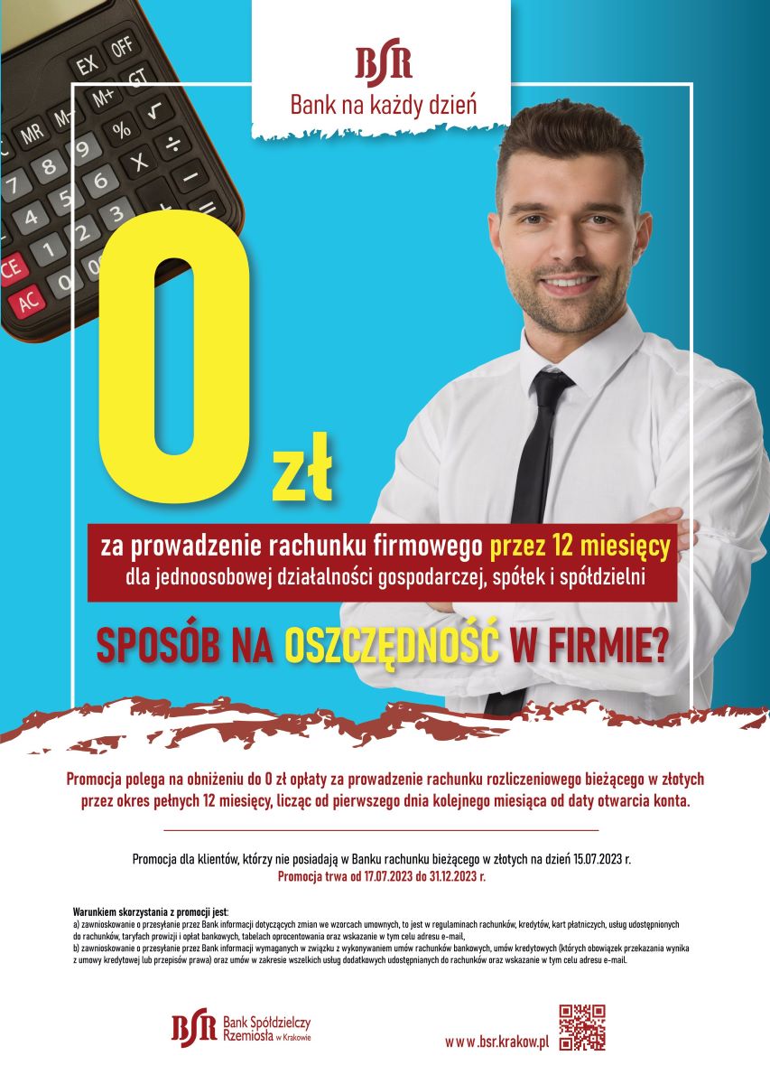 Promocja polega na obniżeniu do 0 zł opłaty za prowadzenie rachunku rozliczeniowego bieżącego w złotych przez okres pełnych 12 miesięcy, licząc od pierwszego dnia kolejnego miesiąca od daty otwarcia konta. Promocja dotyczy Klientów, którzy nie posiadają w Banku rachunku bieżącego w złotych na dzień 15.07.2023. Promocja trwa od 17.07.2023 do 31.12.2023 r. Warunkiem skorzystania z promocji jest: