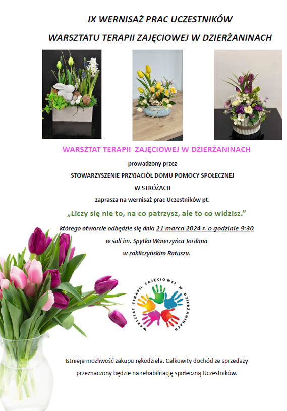 21 marca w Sali im. S. Jordana w zakliczyńskim ratuszu odbędzie się 9 edycja Wernisażu Prac uczestników Warsztatu Terapii Zajęciowej w Dzierżaninach. Otwarcie wydarzenia nastąpi o godzinie 9:30, a całkowity dochód ze sprzedaży rękodzieła przeznaczony zostanie na rehabilitację społeczną uczestników WTZ. Szczegóły na plakacie obok.