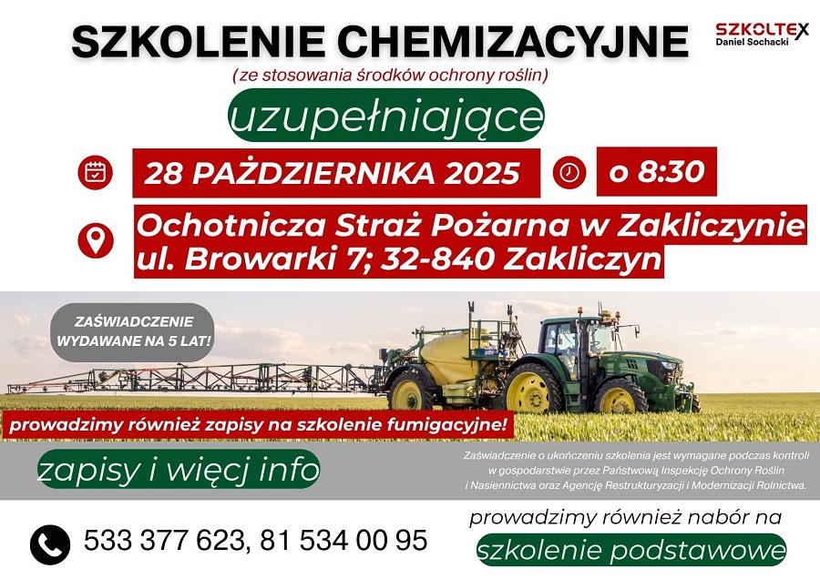 Informujemy rolników o możliwości udziału w obowiązkowym szkoleniu ze stosowania środków ochrony roślin, które odbędzie się 28 października br. w remizie Ochotniczej Straży Pożarnej w Zakliczynie.