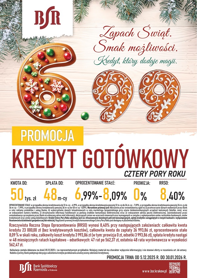 Serdecznie zapraszamy do skorzystania z promocji kredytu Cztery Pory Roku trwającej od 5 grudnia 2025 r. do 30 stycznia 2026 r.