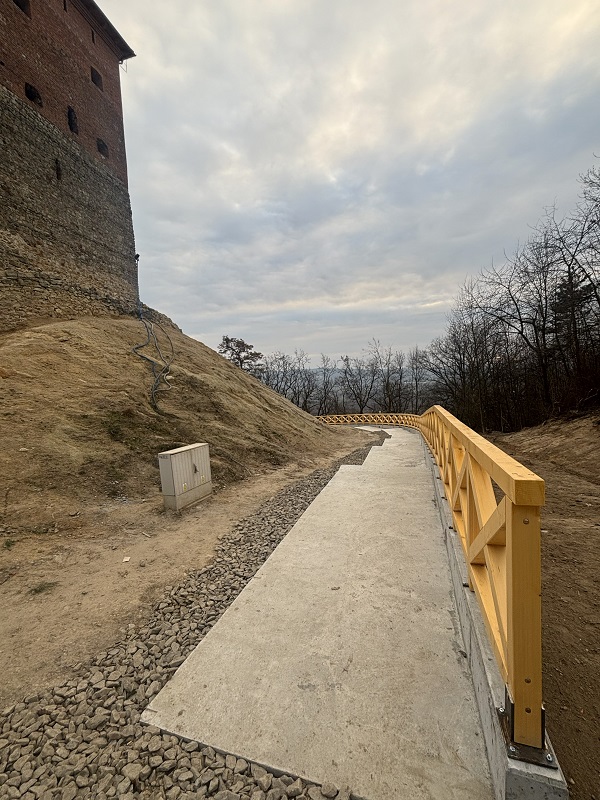 Wybudowana została konstrukcja zabezpieczająca skarpę. Ponadto zabezpieczono nasypy koszami kamiennymi i siatkami oraz powstał cały system odwadniający. Na zabezpieczeniach stabilizujących zewnętrzne mury zamku wykonano ścieżkę turystyczną o szerokości 1,85 m i długości około 100 m, która pozwala obejść i obejrzeć zamek z miejsc dotąd trudno dostępnych.
