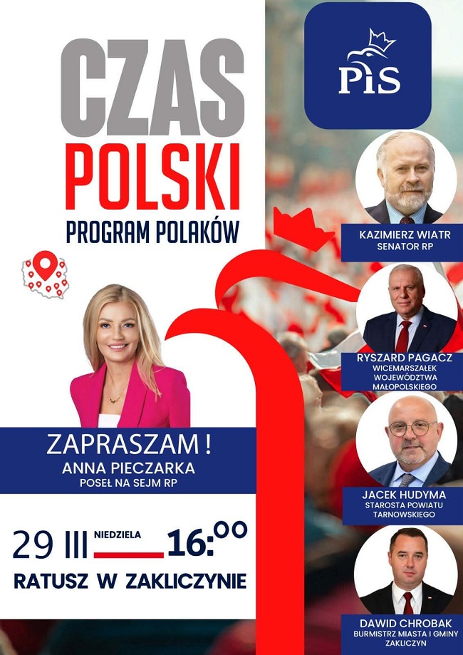 W ramach tej kampanii 29 marca w Zakliczynie, w Sali im. S. Jordana w zakliczyńskim ratuszu odbędzie się spotkanie na które zapraszają: Anna Pieczarka – poseł na Sejm RP, prof. Kazimierz Wiatr – senator Senatu RP, Ryszard Pagacz – wicemarszałek Województwa Małopolskiego, Jacek Hudyma – starosta tarnowski oraz Dawid Chrobak – burmistrz Miasta i Gminy Zakliczyn.