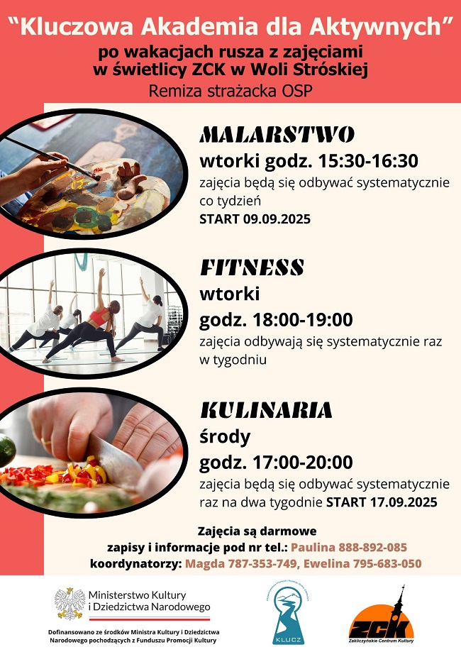 Podczas finałowej, jesiennej edycji projektu wspartej środkami otrzymanymi z budżetu Gminy Zakliczyn, realizowane będą warsztaty; malarskie, kulinarne i fitness. Udział w warsztatach jest nieodpłatny, a szczegółowe informacje na ten temat zdobędziecie u koordynatorek; Magdaleny Tobiasz i Eweliny Siepieli oraz u gospodyń świetlic.