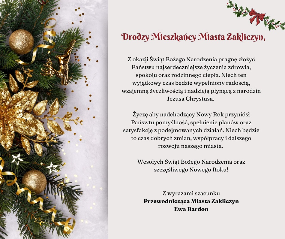 Życzenia świąteczne składa Przewodnicząca Miasta Zakliczyn