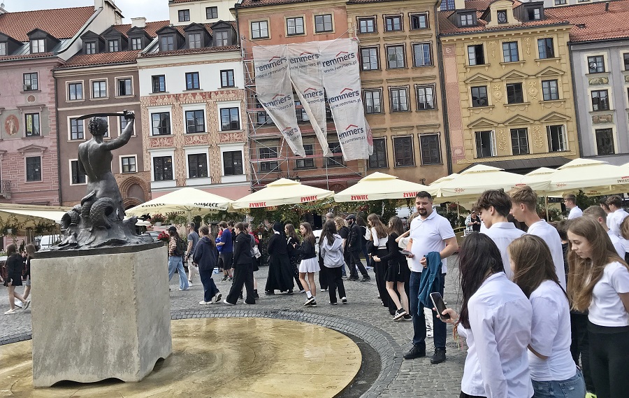 Kolejnym godnym uwagi miejscem był spacer Krakowskim Przedmieściem i zwiedzanie Starego Miasta. Odwiedziliśmy Bazylikę archikatedralną św. Jana Chrzciciela, najważniejsze miejsce kultury i tradycji narodowej Polski, w której zaprzysiężono najstarszą ustawę rządową - Konstytucję 3 maja. Zobaczyliśmy symboliczne punkty związane z historią stolicy, takie jak Kolumna Zygmunta, Syrenka Warszawska, a najwytrwalsi i niezłomni uczestnicy wyjazdu wraz z opiekunem i nauczycielem historii ZSP im. J. Piłsudskiego, SP w Stróżach i Paleśnicy Panem Waldemarem Chrobakiem dodatkowo pokonali 150 kamiennych schodków na taras dzwonnicy św. Anny, aby zobaczyć Zamek Królewski i stolicę z innej perspektywy. Następnie udaliśmy się na Plac Marszałka Józefa Piłsudskiego, gdzie zwiedziliśmy Pomnik Ofiar Katastrofy Smoleńskiej oraz Pomnik Nieznanego Żołnierza – symbol pamięci o bohaterach walczących o niepodległość Polski. Spacer po starym mieście był także okazją do refleksji nad przeszłością Warszawy i jej odbudową po II wojnie światowej.
