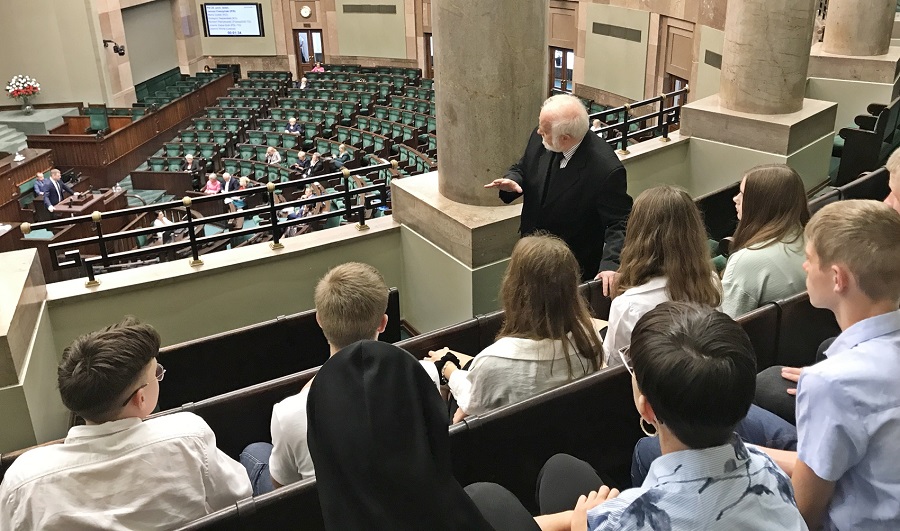 Ważnym etapem wycieczki był pobyt w Parlamencie Rzeczpospolitej Polskiej. Młodzież wraz z opiekunami miała okazję zobaczyć obrady w sali Senatu oraz w sali plenarnej, a także dowiedzieć się, jak działa parlament i jaka jest rola senatorów w tworzeniu prawa. Całości zwiedzania towarzyszyła merytoryczna narracja senatora i profesora nauk technicznych Pana Kazimierza Wiatra, wzbogacona o ciekawostki angażujące młodzież. Po pobycie w Parlamencie dodatkową atrakcją, było zwiedzanie Stadionu Narodowego. Dzień zakończył się pysznym obiadem w warszawskiej restauracji i radosnym powrotem do Zakliczyna.
