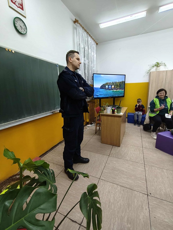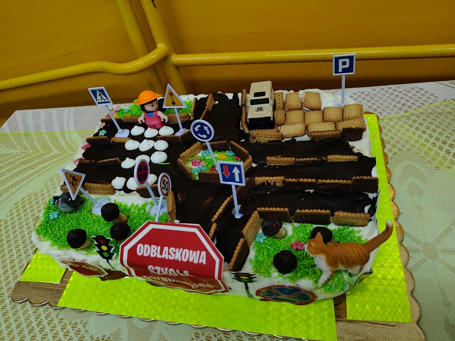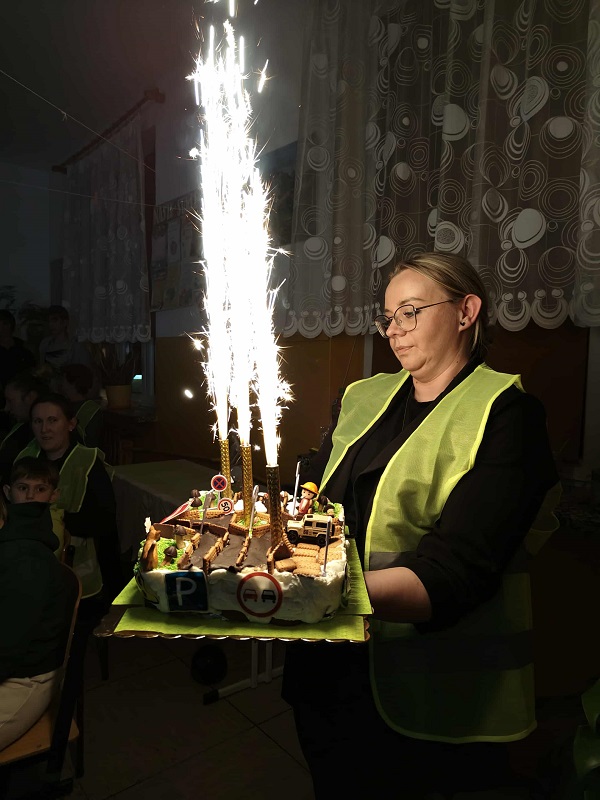 Następnie odbyła się niezwykle ciekawa prelekcja, którą poprowadził mł. asp. Marcin Piech – dzielnicowy Komisariatu Policji w Wojniczu. Policjant omówił zasady bezpiecznego poruszania się po drogach oraz przypomniał, jak właściwie korzystać z elementów odblaskowych. Zwieńczeniem wydarzenia było wspólne odpalenie tortu, przygotowanego specjalnie na tę okazję przez Panią Dyrektor. Na zakończenie wszyscy uczestnicy zrobili sobie pamiątkowe zdjęcie, które w symboliczny sposób pokazuje, jak istotne jest noszenie odblasków dla naszego wspólnego bezpieczeństwa.
