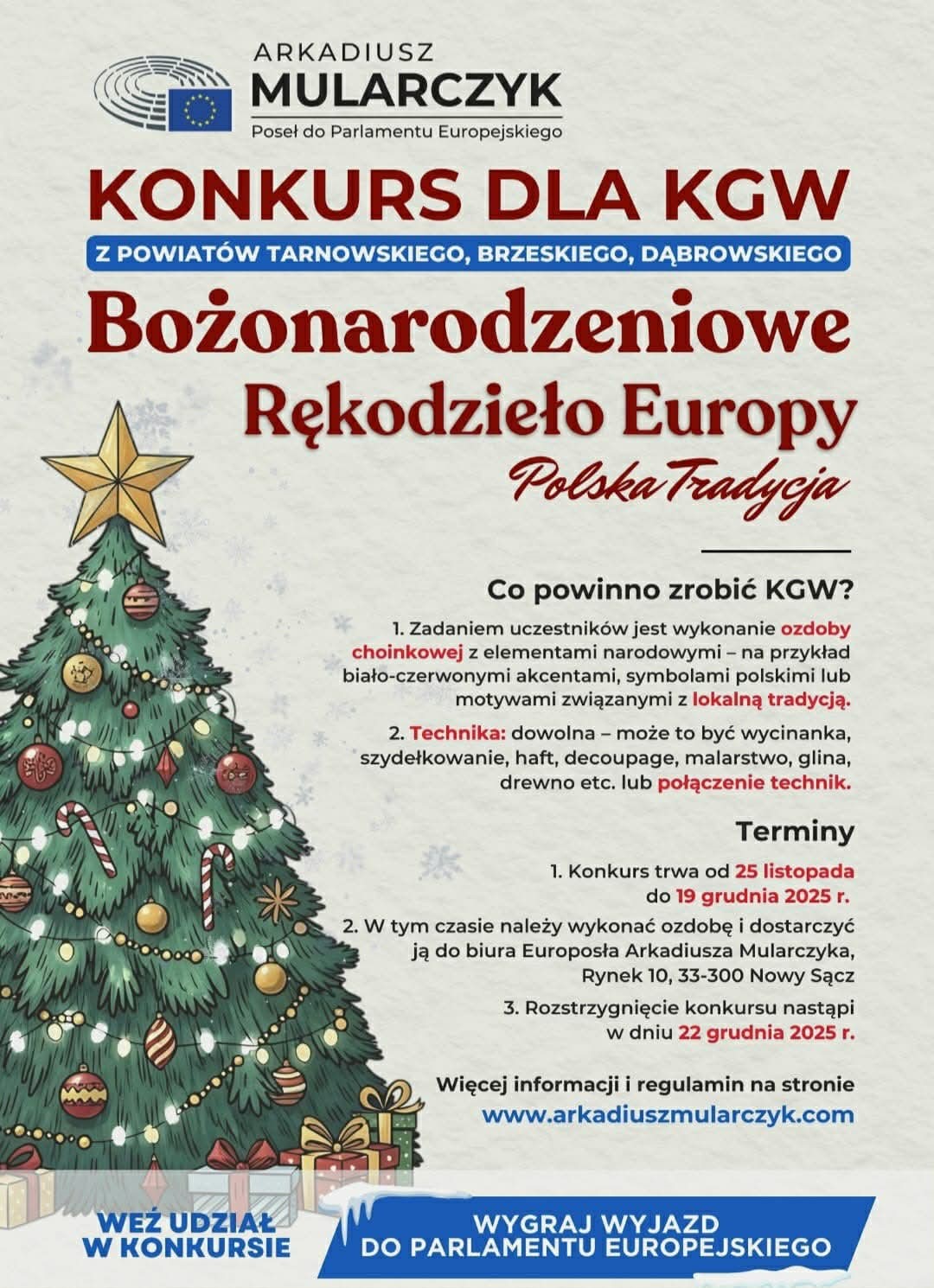 Biuro Posła do Parlamentu Europejskiego Arkadiusza Mularczyka serdecznie zaprasza Koła Gospodyń Wiejskich z Powiatu Tarnowskiego do udziału w konkursie „Bożonarodzeniowe Rękodzieło Europy – Polska Tradycja”.