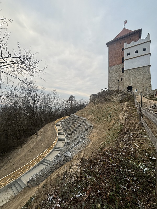 Wybudowana została konstrukcja zabezpieczająca skarpę. Ponadto zabezpieczono nasypy koszami kamiennymi i siatkami oraz powstał cały system odwadniający. Na zabezpieczeniach stabilizujących zewnętrzne mury zamku wykonano ścieżkę turystyczną o szerokości 1,85 m i długości około 100 m, która pozwala obejść i obejrzeć zamek z miejsc dotąd trudno dostępnych.